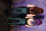 Honeysuckle and Lady Jennifer are almost identically dressed for a messing, wearing genuine American Apparel forest green disco pants over matching black swimsuits with blue highlights, and Hunter wellies, dark blue for Honeysuckle, dark green for Lady Jennifer. And today, they are going to be filling each other's disco pants, swimsuits, and boots, with custard and tomato soup!
