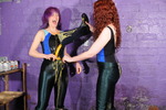 Honeysuckle goes first, holding the waistband of her own disco pants out and inviting Lady Jennifer to fill them, custard first, and then a soup chaser poured in. But Lady Jennifer doesn't escape the mess for long, as now it's her turn and Honeysuckle pours soup and then cuustard into Lady Jennifer's swimsuit, to work its way down and mess up her gleaming green pants from within, even as the gloop in Honeysuckle's outft continues to develop, leaking and staining its way through her shiny clothes.