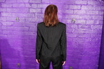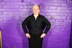 Fidelity wears a black shirt, black pinstripe suit skirt, black pinstripe suit waistcoat, black tights, and smart black office chelsea boots.