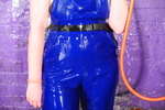 Dressed in blue cotton overalls and a white t-shirt, barefoot, Miss Abigail drenches herself in warm water and thoroughly washes her hair with lashings of shampoo, after a happy day on the mudbanks.