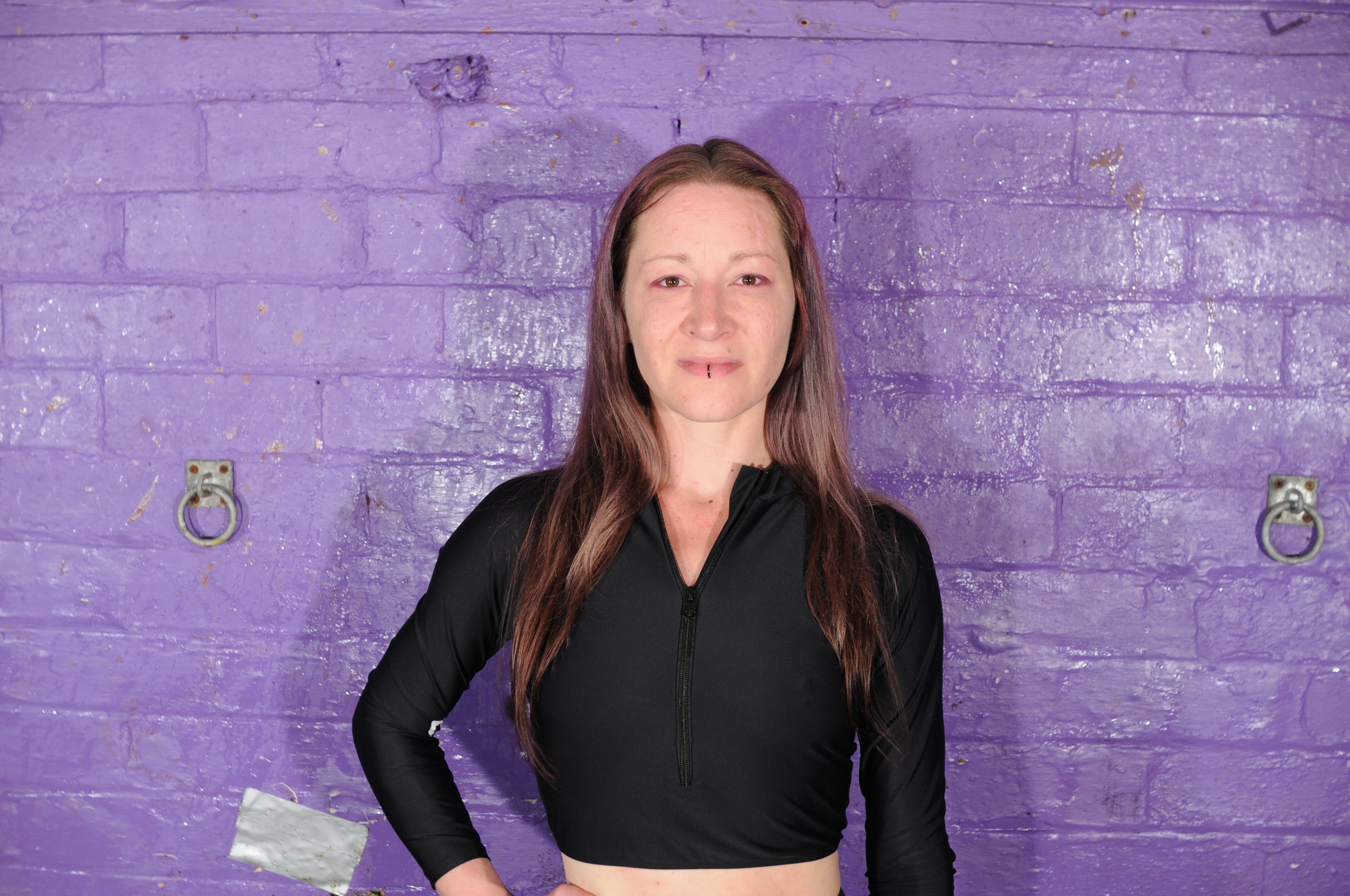 Kjirsten is wearing under her leatherlook suit, two full cans plus a full