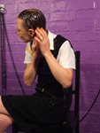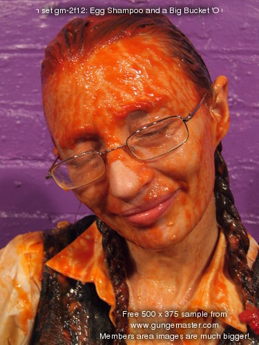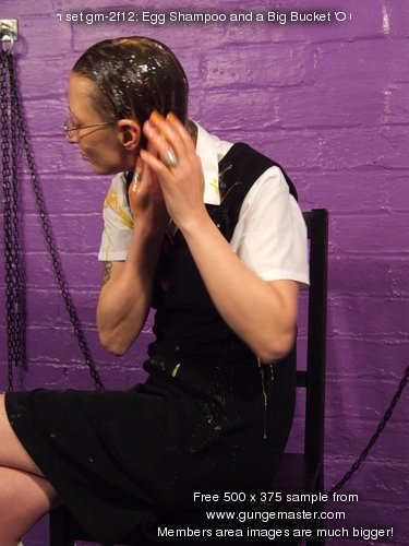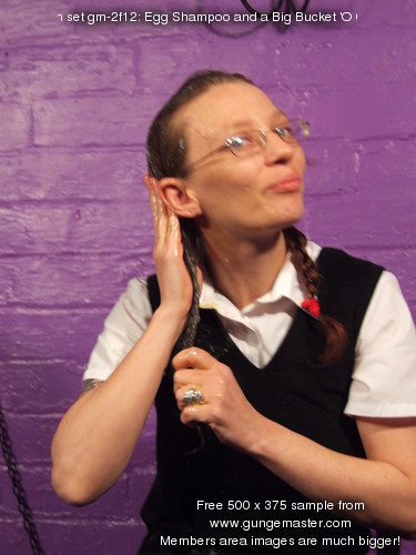 First the bucket 'o goo is prepared and stood to one side, ready for use. Then her ladyship carefully and neatly fills the pockets of her pinnafore with unbroken fresh eggs, takes a seat, and one by one takes the eggs from her pockets, cracks them, and opens them over her head, before shampooing the raw egg carefully into her hair while the overflow is allowed to flow down her outfit leaving eggy streaks on the clean clothing.