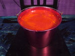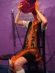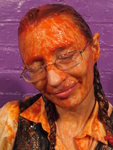 Once she's happy with the hair treatment, she carefully lifts the bucket, full to the brim with organic baked beans, tomato soup, and chopped tomatoes, and pours the contents all down the front of her dress in a lovely deluge of red-orange gunge.