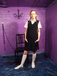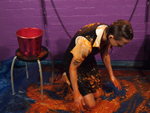 That sees to the front of her uniform but the back is still mostly clean and dry, so she gets down onto the floor and sits, lies and rolls around in the mess, before pouring even more tomato juice all over herself.