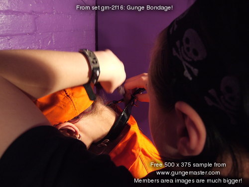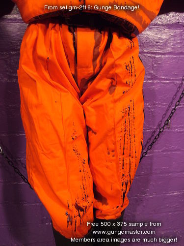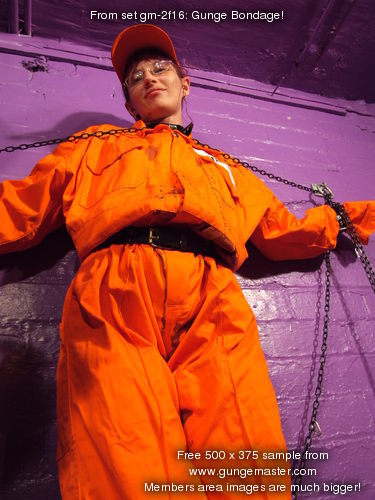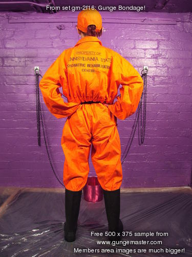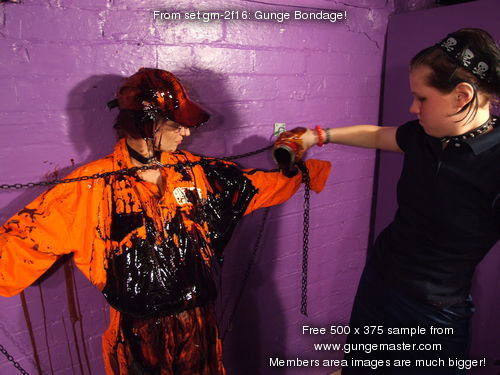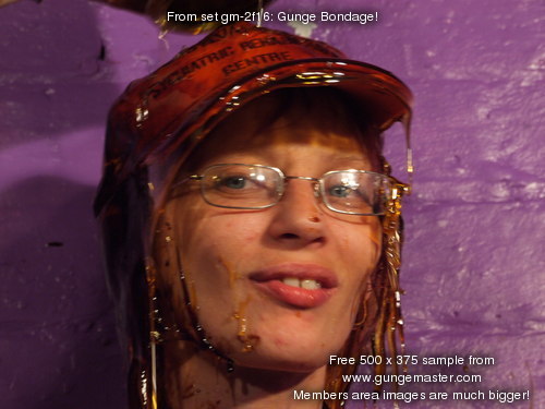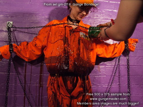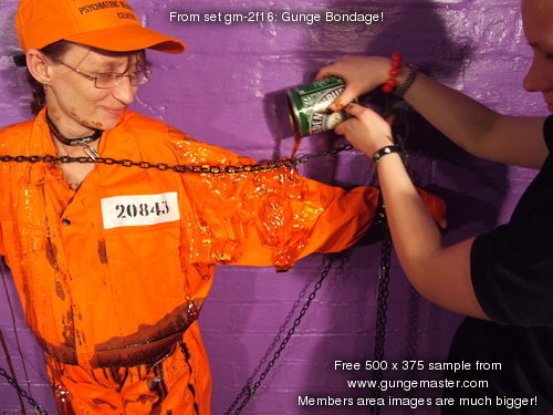 Warder Wendy-Household is relentless, and slowly, slowly, more and more gunge is poured into, and then over, the helpless prisoner, firmly shackled to the unyeilding dungeon walls. Once the uniform suit is well covered, her ladyship is made to watch as her hat is removed, dunked in gunge, and slopped back onto her head. Then more gunge is poured over her head, arms, and over her overalls, until she's been reduced to a saturated sticky mess.