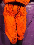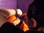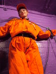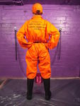 Once her prisoner is properly secured to the wall, the ultra-strict prison warder sets about her work. She has a bucket of liquid black, and this is poured, one beakerful at a time, into the collar of Lady Jasmine's uniform overalls, the thick black fluid flowing smoothly over her skin beneath the orange cotton, gradually staining and soaking through the fabric from within.