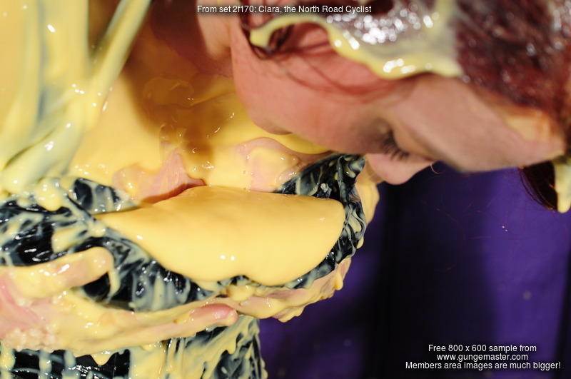 Clara wears a red, white, and blue Sky Sports cycling skinsuit, while Morgana wears her floor length black PVC everyday Dominatrix dress, which is well worn from numerous wearings and gungings. Clara is securely chained to the dungeon wall, and Morgana sets about her with treacle, custard, and rice pudding. Once Morgana thinks Clara has learned her lesson, the dominatrix unchains her and then orders her to gunge the mistress, ensuring the job is done thoroughly and with plenty of gunge poured inside the back of Morgana's dress.