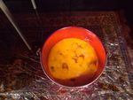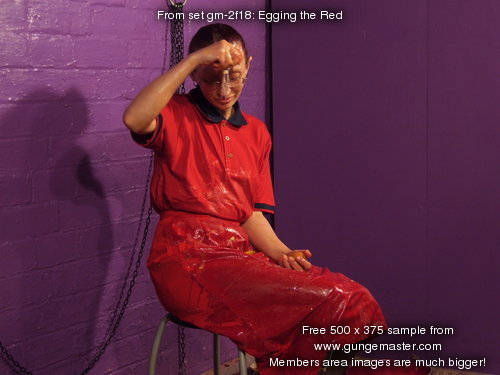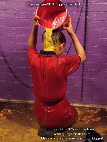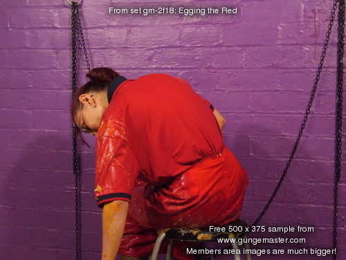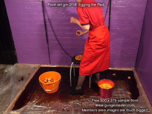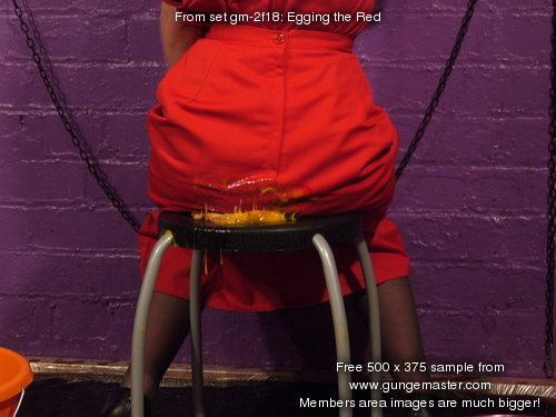 We've all heard the old "are you sitting comfortably? Then I'll begin" line commonly used by storytellers the world over. Well, sitting comfortably is just as important when being gunged as when reading tales, so Lady Jasmine starts this set by carefully placing an empty flan base on a stool, cracking three large eggs into it, and then gracefully sitting herself down in the eggs, leaving a nice comfortable patch of soggy eggy wetness on the back of her skirt.