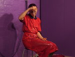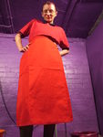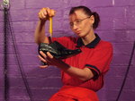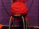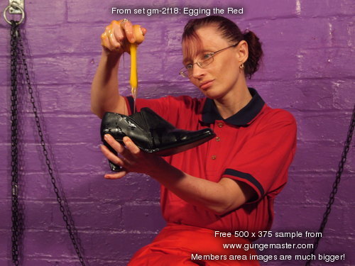 Once she's assured of a comfortable seat, Lady J proceeds to slowly cover every inch of the rest of her outfit in egg mess. First the shoes are filled, and then she puts them back on. Next her tights-clad lower legs get the treatment, and then she cracks many eggs into the lap of her brand new scarlet skirt, the clean crisp material slowly succumbing to the unrelenting deluge of yolks and whites.
