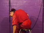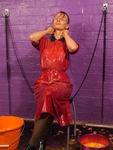 Once the front of the skirt is thoroughly soaked it's the turn of the polo shirt, eggs cracked over each shoulder and all over her front and chest, and then she does her hair too, egg shampoo is one of the best hair treatments available after all.