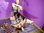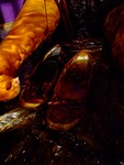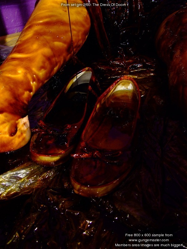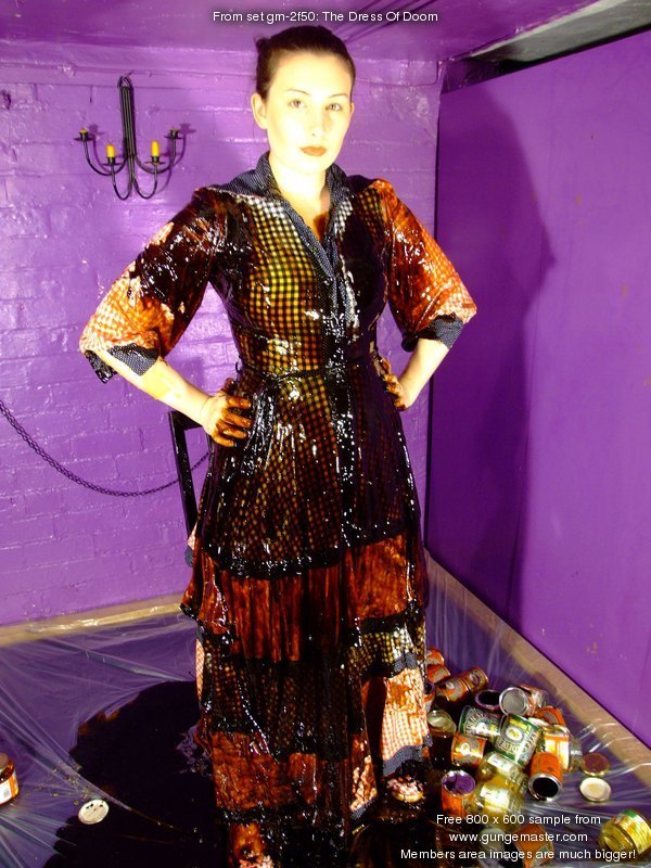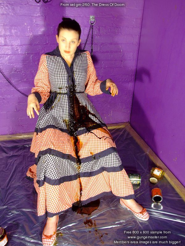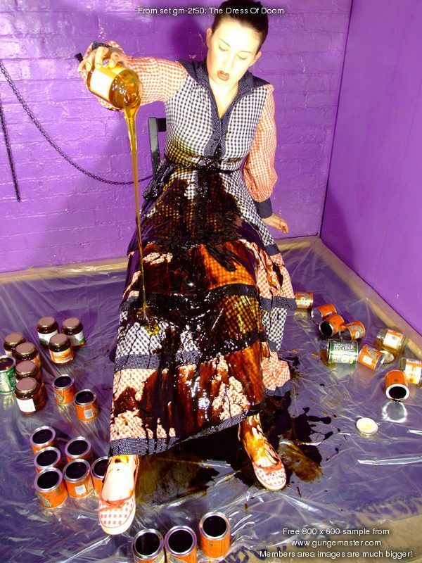 The dress is given a total treatment, filled, and then lavishly coated in mess. The shoes don't escape either, not only do they get covered in goo running off the drenched dress, they also get neatly slipped off, carefully filled with gunge (treacle in one, syrup in the other), and carefully put back onto Veronica's bare feet.