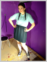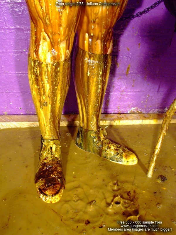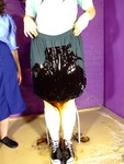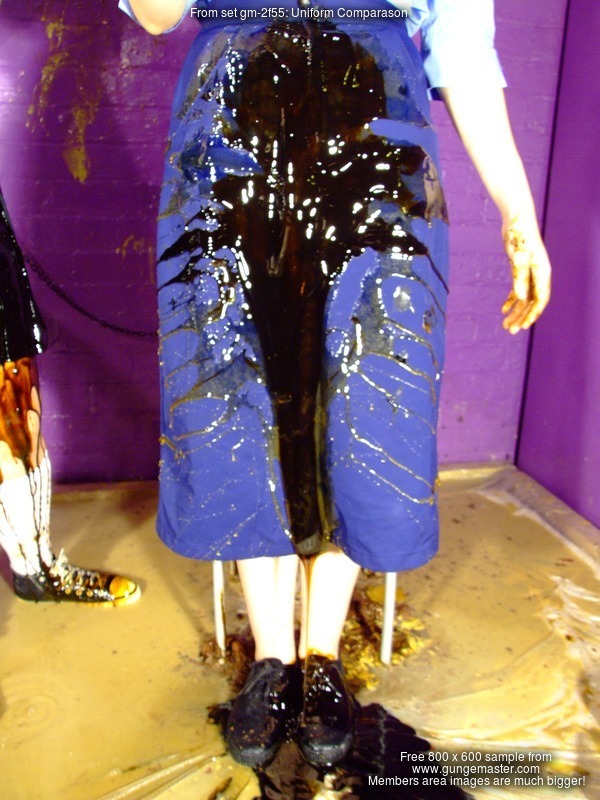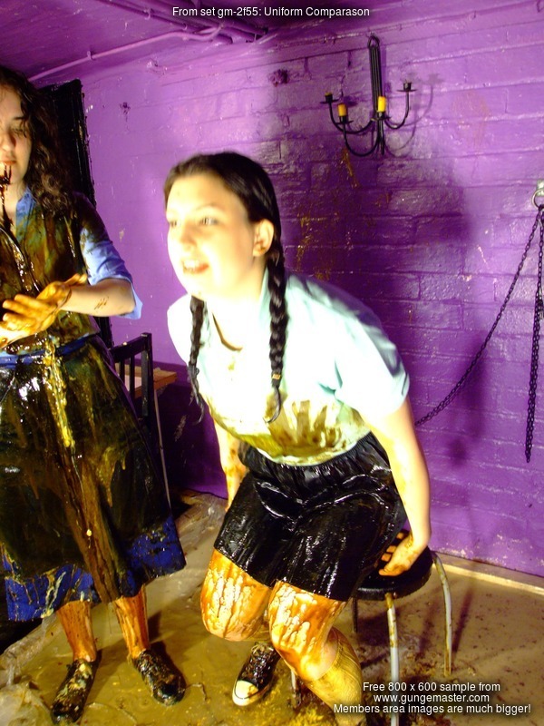 To start off, Lady Rose makes up a nice messy seat for Veronica, then orders her to pull up her games skirt, showing her pristine black swimsuit, and sit herself down in the mess. Squelch! Veronica will have a sticky squelchy bottom for the rest of the session. Her games skirt doesn't escape either, once dropped back into position the mess from her swimsuit's bum starts to seep through the fabric. And then Rose pours treacle into Veronica's lap.