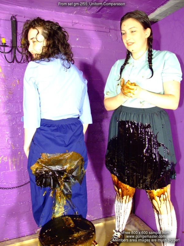 Fair is fair, so Rose now submits to Veronica, and is given a nice messy gateaux, topped off with syrup, to sit in herself. So much for her smart blue uniform skirt - squelch! - and she also has a nice sticky bum. Rose remains seated while Veronica pours more syrup all over the front of Rose's skirt till it pours off the hem and all over her black plimsoles.