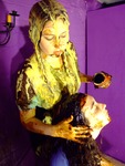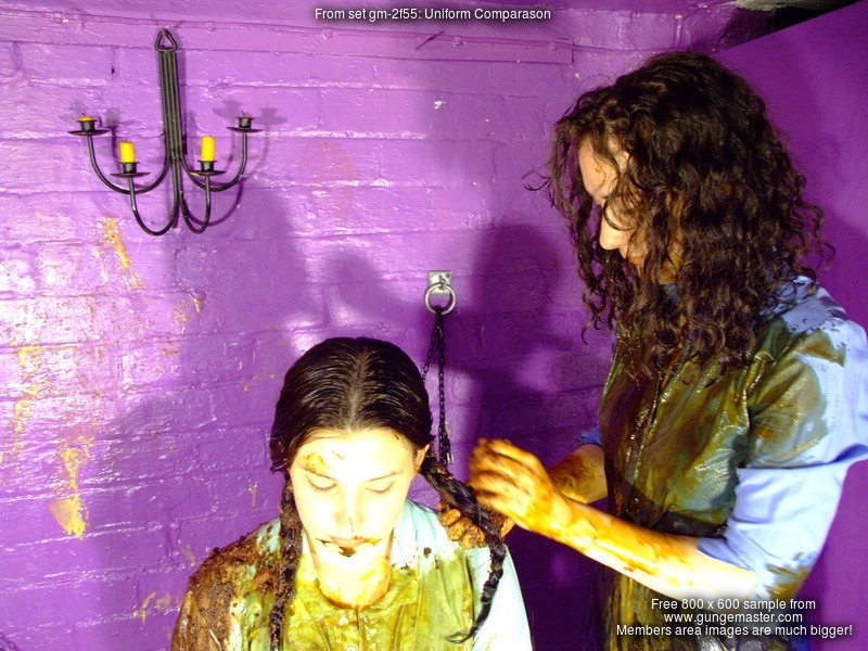 Now the girls have thoroughly tested each other's uniforms, but that's not quite enough - so they give each other very messy shampoos too! Veronica goes first, and then once her hair's been thoroughly drenched in mess it's Rose's turn, her long curly hair completely drenched in custard and treacle.