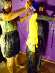 Veronica's shoes and socks are the next to get the treatment, lots of syrup and treacle, and then both socks filled with custard, and then Rose sits down again and has her plimsoles liberally coated with strawberry getaux.