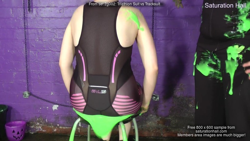 Felicity wears a black and dark pink triathlon suit by Speedo, while Rosemary wearss a brand new Adidas jogging suit, over a black swimsuit. They both look fabulous all clean and dry, but are about to look even more fabulous once they've drenched each other in gallons of goo.