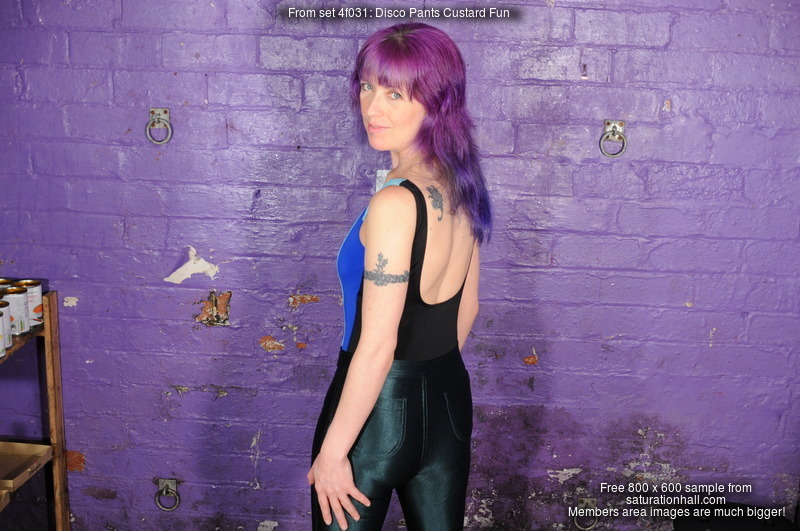 Honeysuckle goes first, holding the waistband of her own disco pants out and inviting Lady Jennifer to fill them, custard first, and then a soup chaser poured in. But Lady Jennifer doesn't escape the mess for long, as now it's her turn and Honeysuckle pours soup and then cuustard into Lady Jennifer's swimsuit, to work its way down and mess up her gleaming green pants from within, even as the gloop in Honeysuckle's outft continues to develop, leaking and staining its way through her shiny clothes.