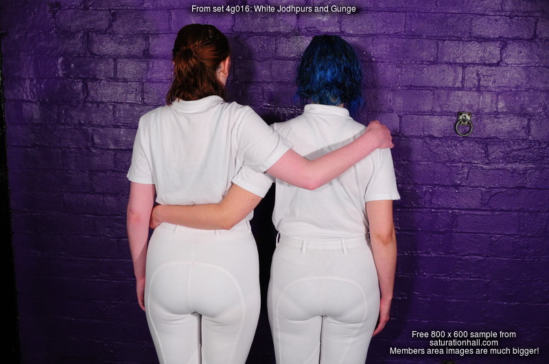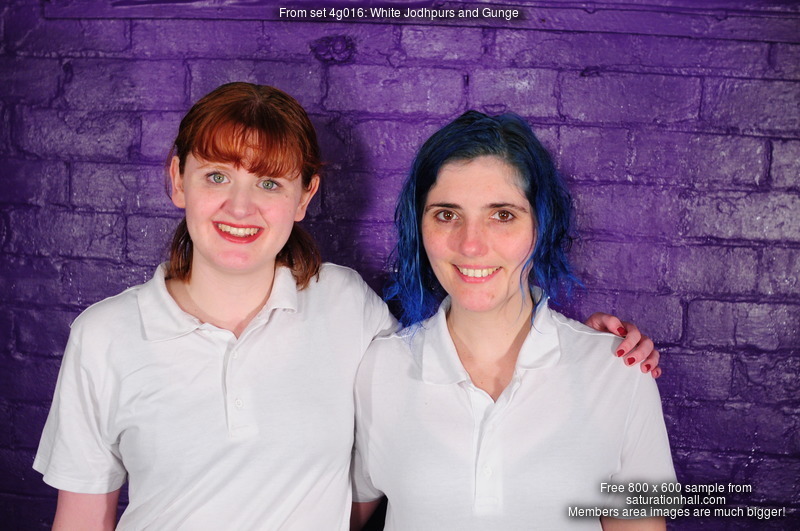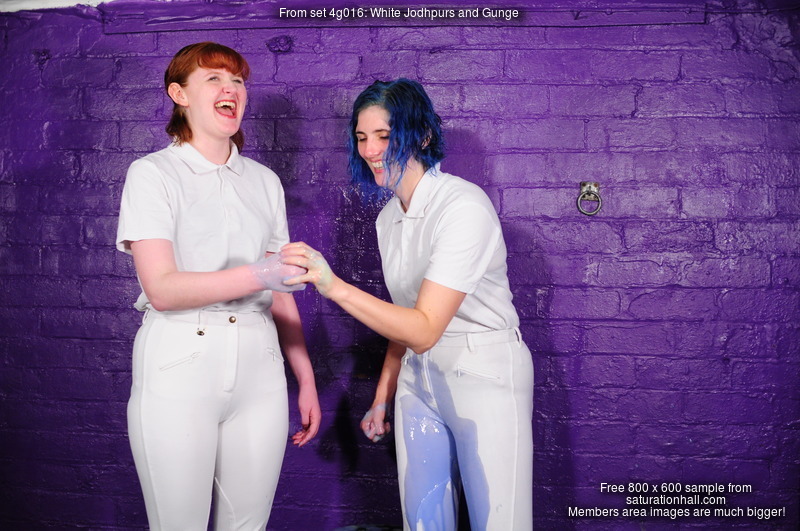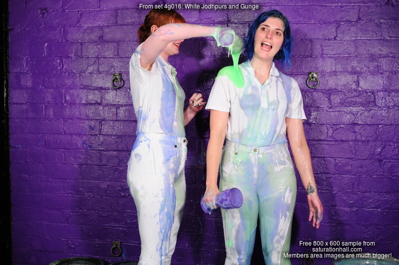 Jodhpur filling comes first and soon those lovely white horse-riding pants are not so white any more as coloured gloop flows down inside them and soaks through the fabric from within. Their polo shirts don't escape the messing and are soon also being filled, before they completely cover each other from head to toe in gunge. They fill their boots, take them off and empty the contents over each other, then fill them to the brim again, pour more gloop, and put them back on.
