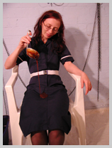 Jasmine starts sitting in her white plastic chair, dressed in her smart uniform, with a ladle and a nice big tub of fresh gravy beside her. Starting with her lap, she scoops up ladle after ladle of gunge and pours them onto her costume, first filling her lap till the goo runs over her knees and pours onto her shoes, then standing up, creating a pool of gravy on the seat, and sitting in it, before moving on to pour more gravy both over and inside the top of her dress. Later on she shampoos her hair in the tub of gravy, before picking the whole tub up and pouring the remaining liquid all over herself. She ends up totally and utterly drenched in gravy, inside and out.